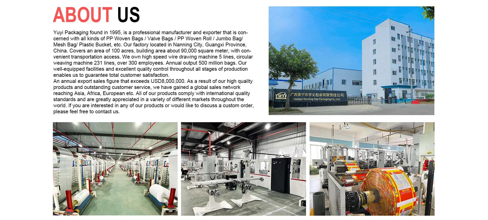 NANNING YUYI PACKAGING CO., LTD. found in 1995, is a professional manufacturer and exporter that is concerned with all kinds of PP Woven Bag / pp Valve Bag / Paper Valve Bag / Paper Bag / PP Woven Roll / Plastic Bucket .
